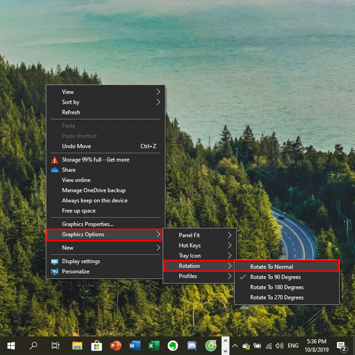 Nhấn chuột phải vào màn hình Desktop, rồi sau đó chọn Graphics Options > Rotation > Rotate To Normal.