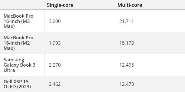 Trên bài kiểm tra điểm chuẩn Geekbench 6, đo hiệu năng CPU, MacBook Pro 16 inch với M3 Max đã ghi được số điểm lõi đơn là 3.200 và điểm số đa lõi đáng kinh ngạc là 21.711.