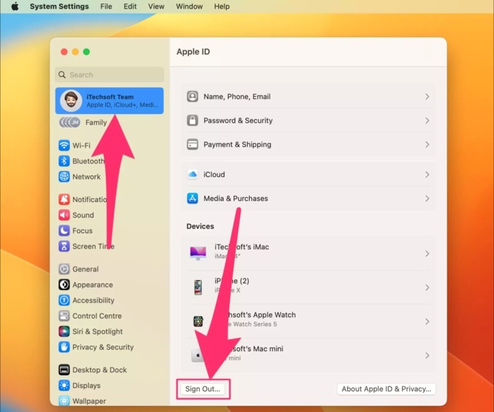 Bước 2: Nhấn vào tên Apple ID của bạn ở đầu thanh bên -> Bấm Đăng xuất