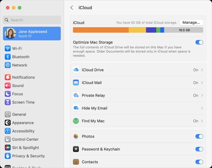 - Với macOS Ventura 13 đến 13.2, bạn chọn menu Apple -> Cài đặt hệ thống, bấm vào tên Apple ID tại đầu thanh bên, nhấn iCloud ở bên phải -> Bật Danh bạ bằng cách nhấn On.
